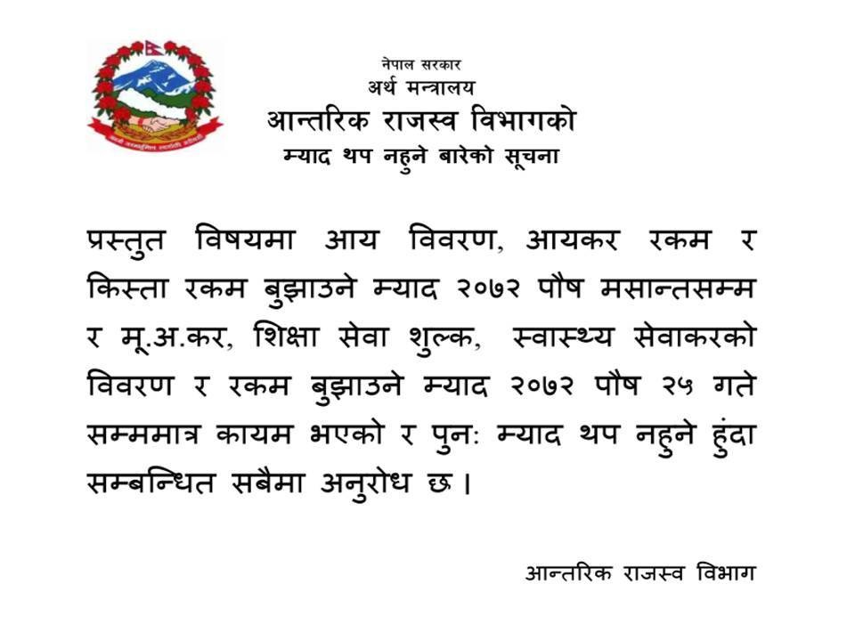 As notified by IRD...No extension shall be granted by the tax authority beyond the date specified earlier.